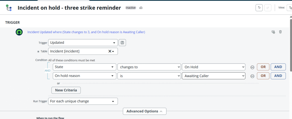 The flow must only run when an Incident is initially set to the specific “On Hold” state and reason that requires the reminder.