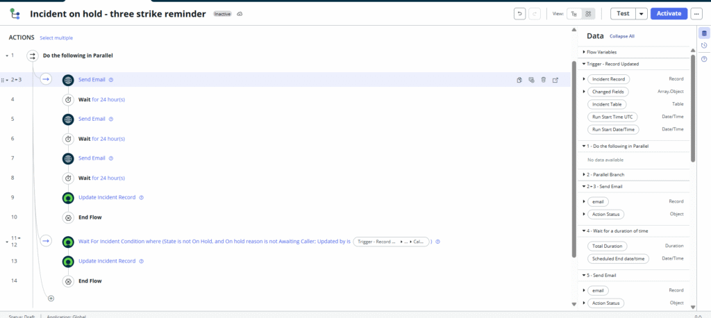 This article details how to use Flow Designer to create an automated “three-strike” reminder system for Incidents placed on hold, specifically when they are Awaiting Caller. This automation helps ensure that incidents don’t remain stagnant and are either resolved or closed after three consecutive reminders.
